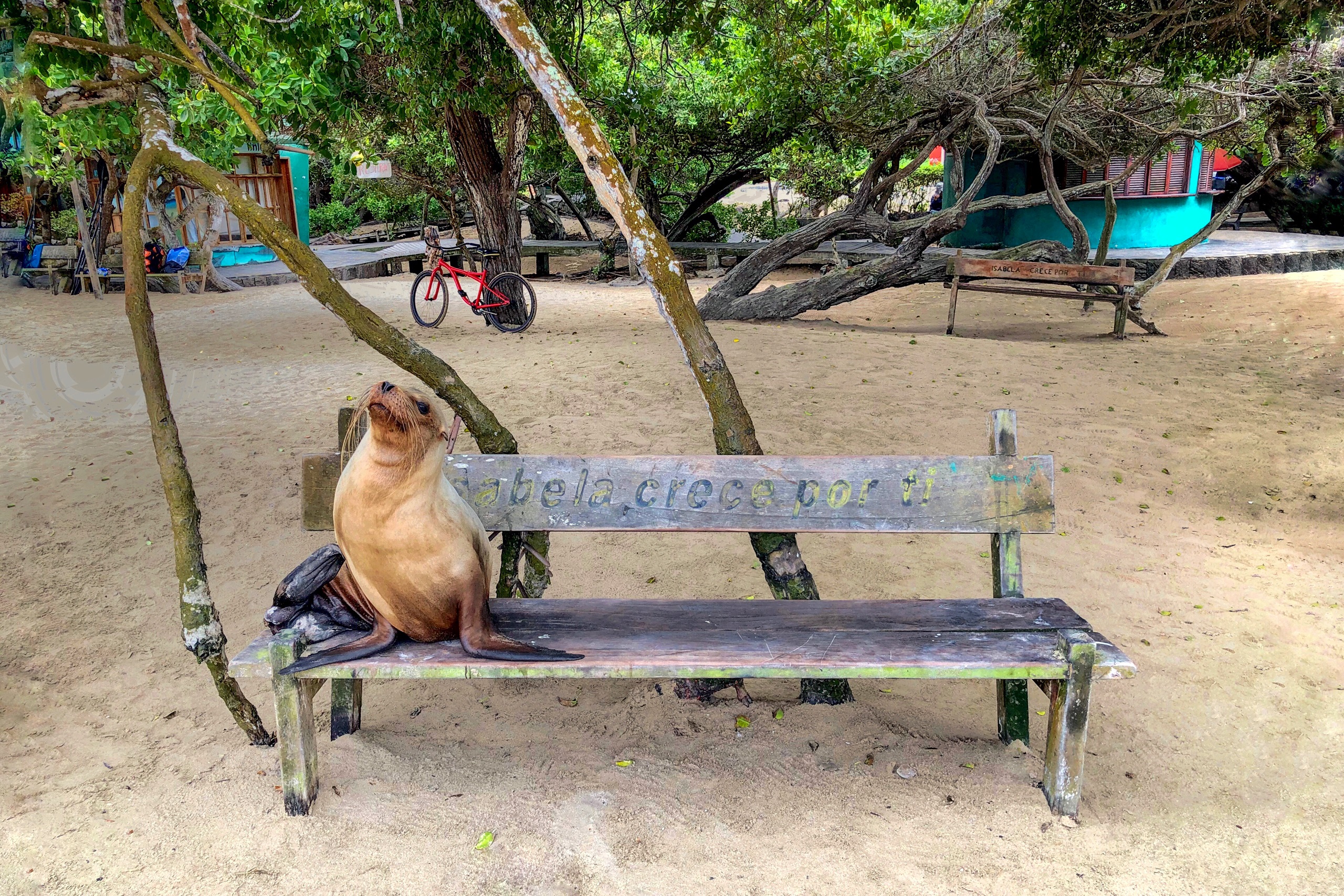 Wanneer we terug in het dorp een kijkje nemen op de pier, zijn we blij verrast. Overdag kun je genieten van de pelikanen, blauwvoetgenten en fregatvogels die het water in duiken om een vis te vangen. Ook ´s avonds valt hier genoeg te beleven, wanneer de rifhaaien aangetrokken worden door het licht onder de pier en zeeleeuwen een slaapplekje zoeken op een van de houten bankjes.