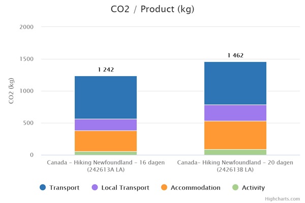 Op reis gaan betekent een onvermijdelijke CO2 voetafdruk. Ook deze reis naar Newfoundland ontkomt daar niet aan. Hoe groot is mijn voetafdruk? In onderstaand diagram kun je zien welke voetafdruk jij achterlaat met je reis. Ook zie je het verschil tussen de 16-daagse en de 20-daagse reis.