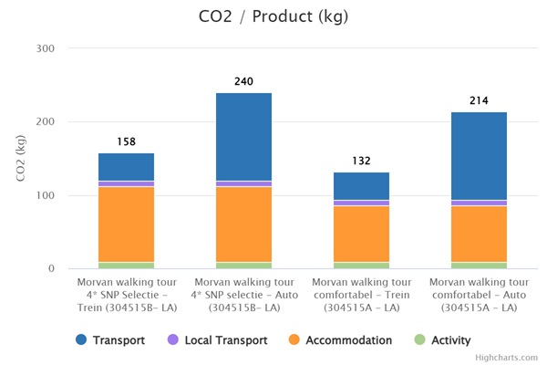 Op reis gaan betekent een onvermijdelijke CO2 voetafdruk. Ook deze reis naar de Morvan ontkomt daar niet aan. Hoe groot is mijn voetafdruk? In onderstaand diagram kun je zien welke voetafdruk jij achterlaat met je reis. Je ziet ook het verschil wanneer je per trein of per auto reist en het verschil tussen de A (comfortabel) en B (SNP-selectie) reis.
