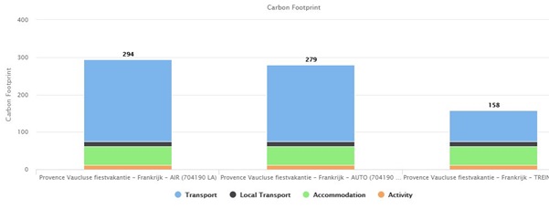 Op reis gaan betekent een onvermijdelijke CO2 voetafdruk. Zelfs deze reis naar de Provence ontkomt daar niet aan. Hoe groot is mijn voetafdruk? In onderstaand diagram kun je zien welke voetafdruk jij achterlaat met je reis. Je ziet ook het verschil wanneer je per trein, per vliegtuig of per eigen auto reist.