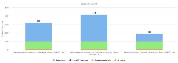 Op reis gaan betekent een onvermijdelijke CO2 voetafdruk. Zelfs deze reis naar de Queyras ontkomt daar niet aan. Hoe groot is mijn voetafdruk? In onderstaand diagram kun je zien welke voetafdruk jij achterlaat met je reis. Je ziet ook het verschil wanneer je per trein, per vliegtuig of per eigen auto reist.