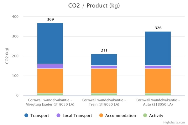 Op reis gaan betekent een onvermijdelijke CO2 voetafdruk. Ook deze reis naar Cornwall ontkomt daar niet aan. Hoe groot is mijn voetafdruk? In onderstaand diagram kun je zien welke voetafdruk jij achterlaat met je reis. Je ziet ook het verschil wanneer je per trein, per vliegtuig of per eigen auto reist.