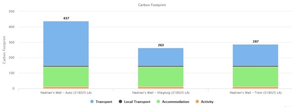 Op reis gaan betekent een onvermijdelijke CO2 voetafdruk. Ook deze reis naar Noord Engeland ontkomt daar niet aan. Hoe groot is mijn voetafdruk? In onderstaand diagram kun je zien welke voetafdruk jij achterlaat met je reis. Je ziet ook het verschil wanneer je per trein, per vliegtuig of per eigen auto reist.