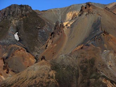Surrealistisch is waarschijnlijk het enige woord dat in de buurt komt om de sfeer te beschrijven die het landschap rondom de Hrafntinnusker uitstraalt. Aquareltinten worden doorsneden met stoomflarden en in de scherp ingesneden canyons groeit felgekleurd bronmos. Na een golvend rhyoliet landschap volgt een stevige afdaling naar de vlakkere gronden waar het Álftavatn is gelegen, een prachtig meer. Achter je liggen de onbegroeide rhyolietbergen, vóór je donker gekleurde tufsteenbergen en witte ijskappen. Wandeling: 11 km, 100 m stijgen en 550 m dalen, 5 uur.