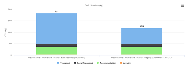 Op reis gaan betekent een onvermijdelijke CO2 voetafdruk. Ook deze reis naar West-Sicilië ontkomt daar niet aan. Hoe groot is mijn voetafdruk? In onderstaand diagram kun je zien welke voetafdruk jij achterlaat met je reis. Je ziet ook het verschil wanneer je per vliegtuig of per auto reist.