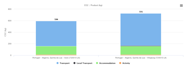 Op reis gaan betekent een onvermijdelijke CO2 voetafdruk. Ook deze reis naar de Algarve ontkomt daar niet aan. Hoe groot is mijn voetafdruk? In onderstaand diagram kun je zien welke voetafdruk jij achterlaat met je reis. Je ziet ook het verschil wanneer je per vliegtuig of per auto reist.