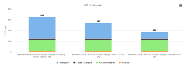 Op reis gaan betekent een onvermijdelijke CO2 voetafdruk. Ook deze reis naar Picos de Europa ontkomt daar niet aan. Hoe groot is mijn voetafdruk? In onderstaand diagram kun je zien welke voetafdruk jij achterlaat met je reis. Je ziet ook het verschil wanneer je per trein, per vliegtuig of per eigen auto reist.