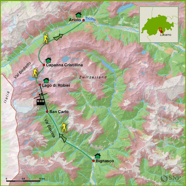 Deze huttentocht naar Ticino is bijzonder omdat we in korte tijd het ruige, pure hart van de zuidelijke Alpen doorkruisen. De Sentiero Cristallina verbindt diepe, bijna mythische valleien met hoogalpien gletsjerlandschap: van de wilde Val Bavona met haar stenen dorpjes en watervallen, via turquoise stuwmeren en kristalrijk gesteente aan de voet van de Basòdino-gletsjer, tot aan de weidse panorama’s richting de Gotthard. De combinatie van rustige, authentieke dorpen, spectaculaire natuur, goed begaanbare maar avontuurlijke bergpaden en overnachtingen in karaktervolle hutten en hotels maakt deze tocht intens, afwisselend en onvergetelijk.
