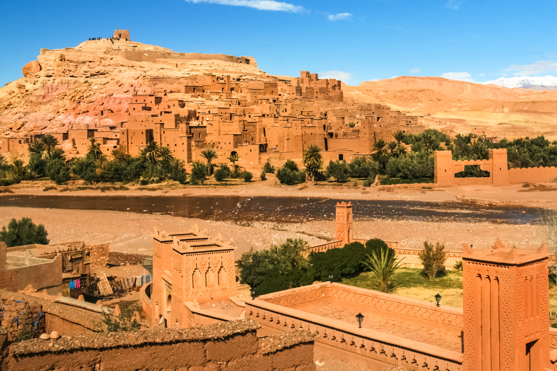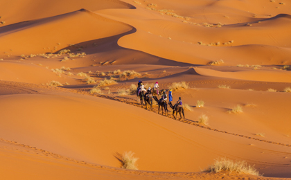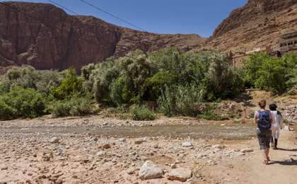 Na onze overnachting in de ksar rijden we naar het zuidoosten, naar Merzouga en de zandduinen van Erg Chebbi. Bij aankomst in Merzouga is het zo heet dat we meteen het zwembad induiken, maar aan het begin van de avond, als het iets is afgekoeld, trekken we met kamelen de zandduinen in, om vanaf een van de duintoppen te zien hoe de zon ondergaat. Duizend kleurschakeringen, de silhouetten van de kamelen op de richel van een zandduin… Erg Chebbi is een redelijk drukke en toeristische trekpleister, dat kun je jammer vinden, maar het is niet voor niets.