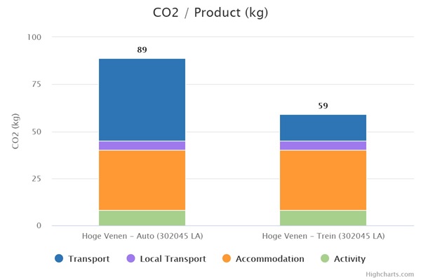 Op reis gaan betekent een onvermijdelijke CO2 voetafdruk. Zelfs deze reis naar België ontkomt daar niet aan. Hoe groot is mijn voetafdruk? In onderstaand diagram kun je zien welke voetafdruk jij achterlaat met je reis. Je ziet ook het verschil wanneer je per trein of per auto reist.