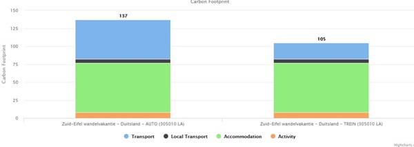 Op reis gaan betekent een onvermijdelijke CO2 voetafdruk. Zelfs deze reis naar Duitsland ontkomt daar niet aan. Hoe groot is mijn voetafdruk? In onderstaand diagram kun je zien welke voetafdruk jij achterlaat met je reis. Je ziet ook het verschil wanneer je per trein of per auto reist.