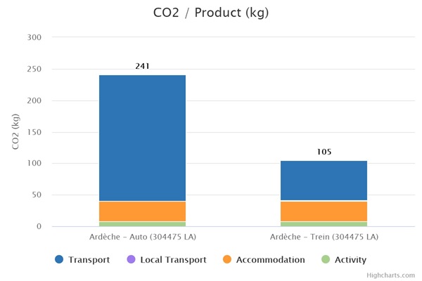 Op reis gaan betekent een onvermijdelijke CO2 voetafdruk. Zelfs deze reis naar Frankrijk ontkomt daar niet aan. Hoe groot is mijn voetafdruk? In onderstaand diagram kun je zien welke voetafdruk jij achterlaat met je reis. Je ziet ook het verschil wanneer je per trein of per auto reist.