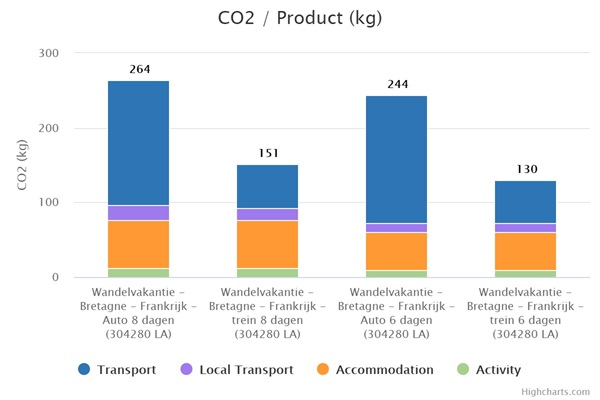 Op reis gaan betekent een onvermijdelijke CO2 voetafdruk. Ook deze reis naar Bretagne ontkomt daar niet aan. Hoe groot is mijn voetafdruk? In onderstaand diagram kun je zien welke voetafdruk jij achterlaat met je reis. Je ziet ook het verschil wanneer je per trein of per auto reist.
