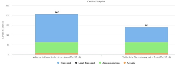 Op reis gaan betekent een onvermijdelijke CO2 voetafdruk. Zelfs deze reis naar Vallee de la Claree ontkomt daar niet aan. Hoe groot is mijn voetafdruk? In onderstaand diagram kun je zien welke voetafdruk jij achterlaat met je reis. Je ziet ook het verschil wanneer je per trein of per auto reist.