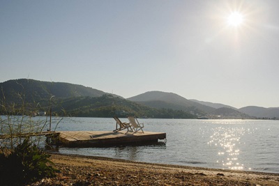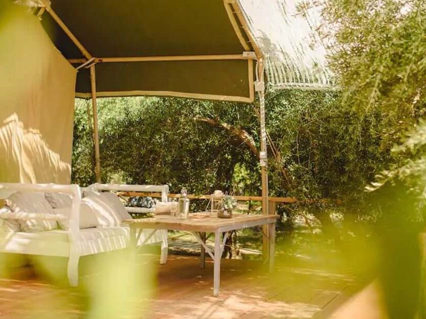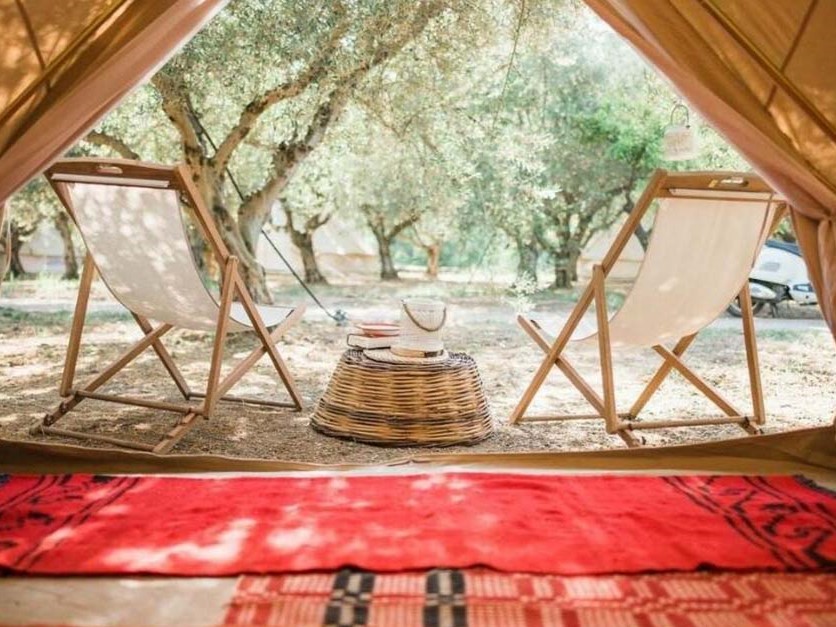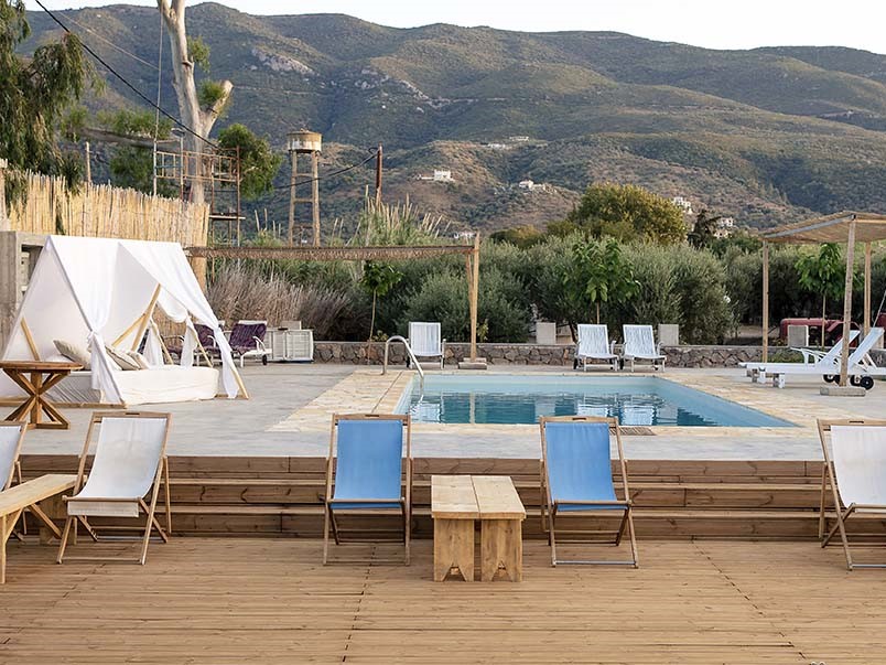 Je verblijft in ingerichte tenten, of kleine huisjes op een ruim opgezette camping aan zee, bij Galatas, schuin tegenover het eiland Poros. Er is schaduw van olijfbomen, er is een gemeenschappelijk terras en lounge, waar je ook kunt ontbijten. Op het terrein is ook een zwembad, met ligstoelen. Elke unit heeft eigen sanitair, deels (vlak) naast tent of huisje en eenvoudige kookgelegenheid. Er is een terras, zitje en eettafel met stoelen en soms ook een hangmat. Je kunt kiezen uit: