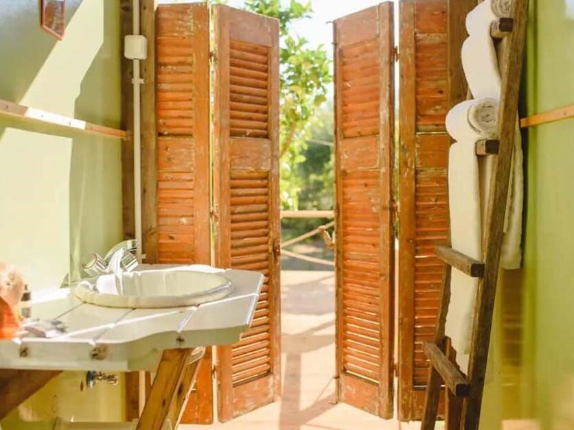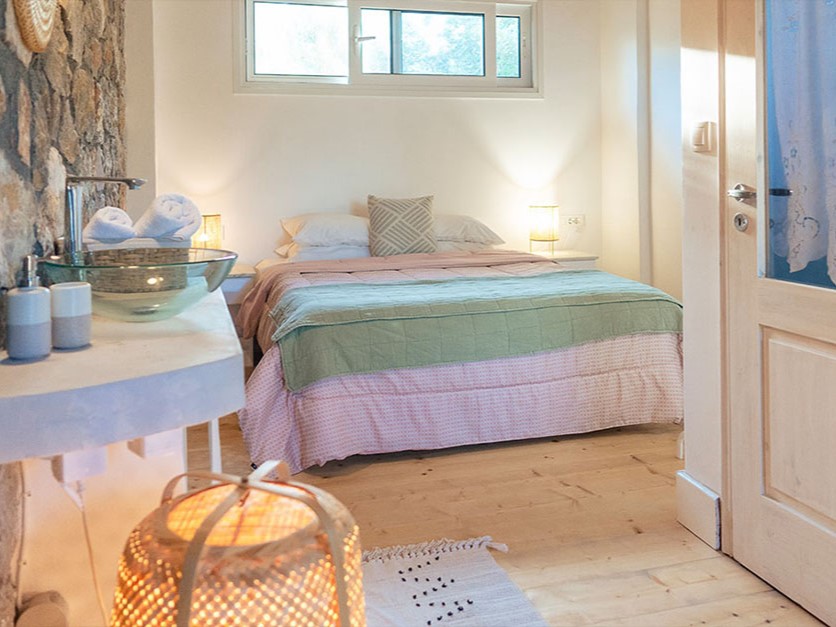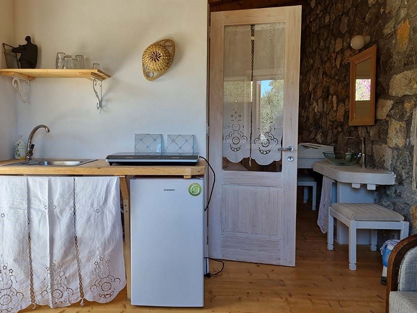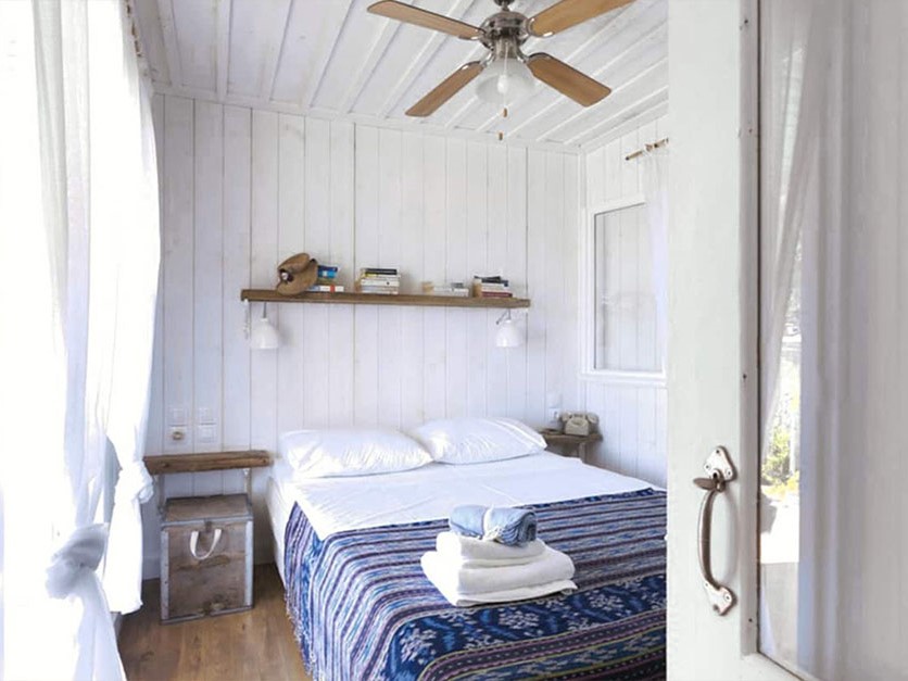 - Chalet. Klein stenen huisje met tweepersoonsbed met cocomat matras, plus een tot extra bed omvormbare stoel.