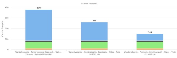Op reis gaan betekent een onvermijdelijke CO2 voetafdruk. Ook deze reis naar Wales ontkomt daar niet aan. Hoe groot is mijn voetafdruk? In onderstaand diagram kun je zien welke voetafdruk jij achterlaat met je reis. Je ziet ook het verschil wanneer je per trein, per vliegtuig of per eigen auto reist.