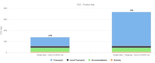 Op reis gaan betekent een onvermijdelijke CO2 voetafdruk. Ook deze reis naar Ierland ontkomt daar niet aan. Hoe groot is mijn voetafdruk? In onderstaand diagram kun je zien welke voetafdruk jij achterlaat met je reis. Je ziet ook het verschil wanneer je per vliegtuig of per auto reist.