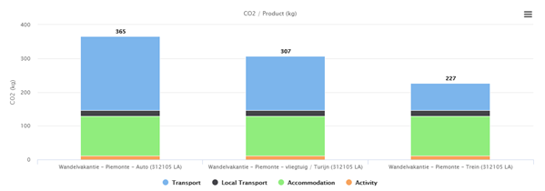 Op reis gaan betekent een onvermijdelijke CO2 voetafdruk. Ook deze reis naar Piemonte ontkomt daar niet aan. Hoe groot is mijn voetafdruk? In onderstaand diagram kun je zien welke voetafdruk jij achterlaat met je reis. Je ziet ook het verschil wanneer je per trein, per vliegtuig of per eigen auto reist.