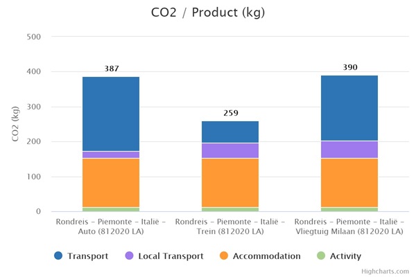 Op reis gaan betekent een onvermijdelijke CO2 voetafdruk. Ook deze reis naar Piemonte ontkomt daar niet aan. Hoe groot is mijn voetafdruk? In onderstaand diagram kun je zien welke voetafdruk jij achterlaat met je reis. Je ziet ook het verschil wanneer je per trein, per vliegtuig of per eigen auto reist.