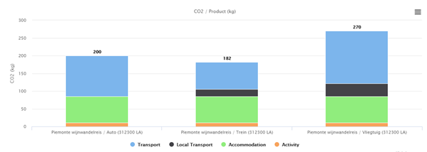 Op reis gaan betekent een onvermijdelijke CO2 voetafdruk. Ook deze reis naar Piemonte ontkomt daar niet aan. Hoe groot is mijn voetafdruk? In onderstaand diagram kun je zien welke voetafdruk jij achterlaat met je reis. Je ziet ook het verschil wanneer je per trein, per vliegtuig of per eigen auto reist.