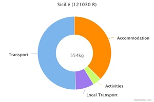 Op reis gaan betekent een onvermijdelijke CO2 voetafdruk. Ook deze reis naar Sicilië ontkomt daar niet aan. Hoe groot is mijn voetafdruk? In onderstaand cirkeldiagram kun je zien welke voetafdruk jij achterlaat met je reis.