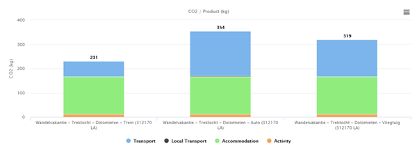 Op reis gaan betekent een onvermijdelijke CO2 voetafdruk. Ook deze reis naar Südtirol ontkomt daar niet aan. Hoe groot is mijn voetafdruk? In onderstaand diagram kun je zien welke voetafdruk jij achterlaat met je reis. Je ziet ook het verschil wanneer je per trein, per vliegtuig of per eigen auto reist.