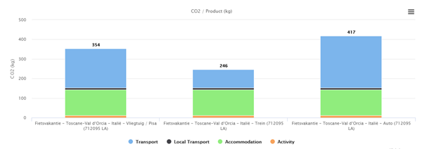 Op reis gaan betekent een onvermijdelijke CO2 voetafdruk. Ook deze reis naar Toscane ontkomt daar niet aan. Hoe groot is mijn voetafdruk? In onderstaand diagram kun je zien welke voetafdruk jij achterlaat met je reis. Je ziet ook het verschil wanneer je per trein, per vliegtuig of per eigen auto reist.