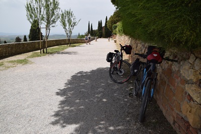 Een niet al te lange fietsdag vandaag met een korte rondrit langs San Quirico en Bagno Vignoni. Het versterkte stadje San Quirico is één van de minst bekende, maar best bewaarde historische centra in de provincie Siena. Het was een belangrijke halte voor pelgrims op weg naar Rome. In de hoofdstraat vind je een aantal goed bewaarde middeleeuwse huizen. De Horti Leonini in San Quirico is een prachtig voorbeeld van een Italiaanse tuin. Bagno Vignoni is een prachtige plaats met oude Romeinse baden. Volgens de legende wonen er waternymfen. De plaats is ook beroemd om zijn graanmolens. Op weg naar Bagno Vignoni kom je door authentiek Toscaans landschap over rustige 'witte wegen'. Na de tussenstop in Bagno Vignoni en wellicht een warm bad keer je weer terug naar Pienza.