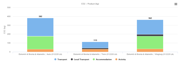 Op reis gaan betekent een onvermijdelijke CO2 voetafdruk. Ook deze reis naar Trentino ontkomt daar niet aan. Hoe groot is mijn voetafdruk? In onderstaand diagram kun je zien welke voetafdruk jij achterlaat met je reis. Je ziet ook het verschil wanneer je per trein, per vliegtuig of per eigen auto reist.