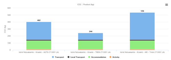 Op reis gaan betekent een onvermijdelijke CO2 voetafdruk. Ook deze reis naar Istrië ontkomt daar niet aan. Hoe groot is mijn voetafdruk? In onderstaand diagram kun je zien welke voetafdruk jij achterlaat met je reis. Je ziet ook het verschil wanneer je per trein, per vliegtuig of per eigen auto reist.