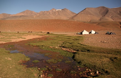 Opnieuw een vroege start want er wacht een stevige tocht. Je ontbijt staat bij zonsopgang gereed en nadat de tenten zijn afgebroken en de muilezels bepakt, ga je op pad. Wat volgt is een prachtige, zeer geleidelijke klim via lange zigzagslingers bochten naar de 3400m hoge Tarkeddit. Vanaf de pas geniet je van een panoramisch uitzicht op de toppen rondom het Mgoun-gebergte, inclusief de ruim vierduizend meter hoge top van de Mgoun. Daarna wacht een geleidelijke afdaling naar het Tarkeddit plateau, dat je deelt met nomadenfamilies die een paar honderd meter verderop kamperen. Op deze grote hoogte (2900 meter) profiteren ze in de zomer van de koele dagen en de relatief vochtige omstandigheden en hoeden er hun kuddes geiten, schapen en kamelen. Toch komt de omgeving droog en verlaten over; een bijzonder landschap van adembenemende schoonheid. Je komt op tijd aan zodat je het de rest van de dag rustig aan kunt doen, ter voorbereiding op de topdag van morgen. Lengte 10 km, 1150m stijgen en 500m dalen, duur 6 uur.
