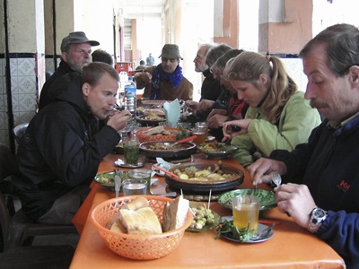 Het verblijf tijdens deze reis is op basis van halfpension, beginnende met het diner op dag 1 en eindigend met het ontbijt op dag 13. Het ontbijt is eenvoudig en bestaat meestal uit brood met abrikozenjam en soms een croissant. We dineren meestal in het restaurant van het hotel waar we verblijven. In Marrakech dineren we in een restaurant op loopafstand van het hotel. Alcoholische drankjes zijn prijzig. In sommige hotels wordt overigens geen alcohol geschonken. Het nuttigen van een zelf meegebracht flesje wijn is overigens meestal geen bezwaar.