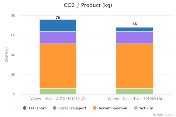 Op reis gaan betekent een onvermijdelijke CO2 voetafdruk. Zelfs deze reis naar de Veluwe ontkomt daar niet aan. Hoe groot is mijn voetafdruk? In onderstaand diagram kun je zien welke voetafdruk jij achterlaat met je reis. Je ziet ook het verschil wanneer je per trein of per auto reist.