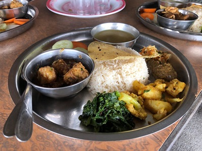 In Kathmandu en Bhaktapur is het ontbijt inbegrepen. Voor de lunch en het diner zoek je een gezellig restaurant op.