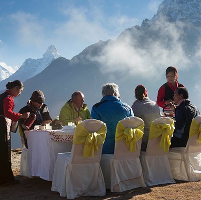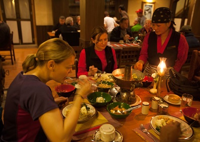 Elke ochtend wordt er een ontbijt geserveerd. De lunches worden als picknick meegenomen of je luncht bij een eethuisje. Bij korte etappes lunch je in het Yeti Mountain Home waar je verblijft of vroeg aankomt. Het avondeten wordt geserveerd op de plek waar je overnacht. In de Mountain Lodges of Nepal worden, gezien de afgelegen en hoge ligging, hele goede maaltijden (met een aantal keuze opties) bereid, waarbij de meeste groente uit eigen tuin of kas komt.