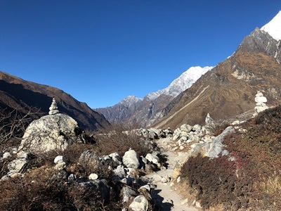 Vanuit Lantang Village loop je vandaag eerst even over breder pad, daarna is het tijd om het stijgende, kronkelende pad een paar uur lang te volgen. Om je heen zie je vele alpiene struiken. Naar mate je verder oostelijk wandelt, wordt de vallei steeds weidser. Al wandelend over de zomerweides geniet je van de immense met sneeuw bedekte pieken in de verte. Je komt langs het belangrijkste klooster van de regio en passeert water molens, gebedswielen en de grootste stenen Mani van Nepal, versierd met vele gebeden. Wandelduur: ca. 4 uur, klimmen 500m, dalen 100m.