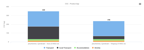 Op reis gaan betekent een onvermijdelijke CO2 voetafdruk. Ook deze reis naar het Gjendemeer ontkomt daar niet aan. Hoe groot is mijn voetafdruk? In onderstaand diagram kun je zien welke voetafdruk jij achterlaat met je reis. Je ziet ook het verschil wanneer je per vliegtuig of per auto reist.