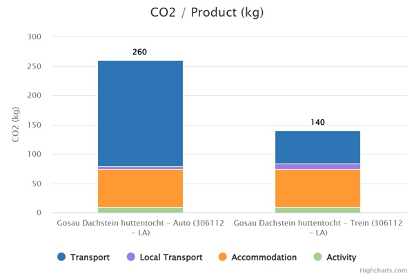 Op reis gaan betekent een onvermijdelijke CO2 voetafdruk. Zelfs deze reis naar Oostenrijk ontkomt daar niet aan. Hoe groot is mijn voetafdruk? In onderstaand diagram kun je zien welke voetafdruk jij achterlaat met je reis. Je ziet ook het verschil wanneer je per trein of per auto reist.