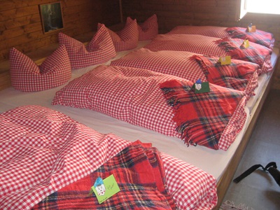 In de hutten slaap je op meerpersoonskamers (Lager). Je dient voor de hutten zelf een lakenzak of slaapzak mee te nemen. Het sanitair in de hutten is op de gang, inclusief (muntjes)douche, je dient zelf een handdoek mee te nemen. Kijk voor de complete uitrusting voor een huttentocht op: Paklijst huttentocht