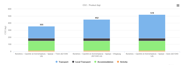 Op reis gaan betekent een onvermijdelijke CO2 voetafdruk. Ook deze reis naar Castilië & Extremadura ontkomt daar niet aan. Hoe groot is mijn voetafdruk? In onderstaand diagram kun je zien welke voetafdruk jij achterlaat met je reis. Je ziet ook het verschil wanneer je per trein, per vliegtuig of per eigen auto reist.