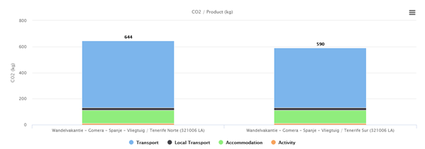 Op reis gaan betekent een onvermijdelijke CO2 voetafdruk. Ook deze reis naar La Gomera ontkomt daar niet aan. Hoe groot is mijn voetafdruk? In onderstaand diagram kun je zien welke voetafdruk jij achterlaat met je reis. Je ziet ook mooi het verschil tussen twee verschillende vluchtopties.