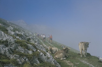 Vandaag een lange maar in landschappelijk opzicht afwisselende en indrukwekkende tocht. Eerst ga je over voetpaden door bos omhoog naar Igüedri, dan over landrovertracks naar de pas Aliva (1645 meter) en vervolgens over een moreen het dal van de rivier de Duje in. Je deelt het weidse landschap met duizenden stuks vee die vrij rondlopen onder het waakzame oog van de gierenkolonie die nestelt in de spelonken van de hoogste pieken aan weerszijden van de pas. Doel is Sotres, het hoogstgelegen dorp in de Picos en een prima uitvalsbasis voor wandelingen. Maar helaas ligt het 150 meter boven de rivier, aan de rand van een zwevend dal. Je moet op het laatst dus nog even klimmen! Totaal 15 km, 700 m stijgen en 550 m dalen, 6,5-7 uur.