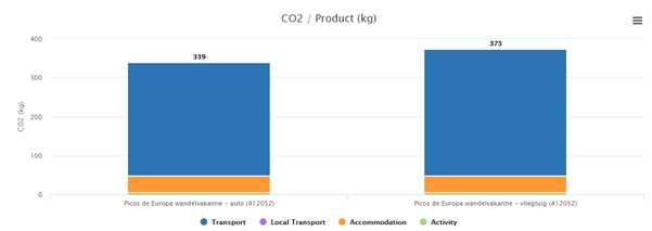 Op reis gaan betekent een onvermijdelijke CO2 voetafdruk. Ook deze reis naar Picos de Europa ontkomt daar niet aan. Hoe groot is mijn voetafdruk? In onderstaand diagram kun je zien welke voetafdruk jij achterlaat met je reis. Je ziet ook het verschil wanneer je per vliegtuig of per auto reist.