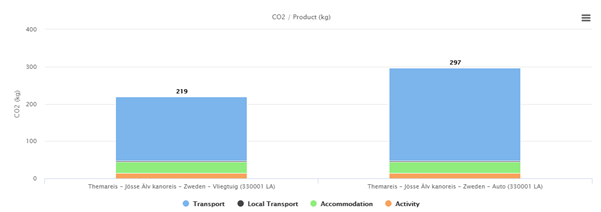 Op reis gaan betekent een onvermijdelijke CO2 voetafdruk. Ook deze reis naar Jösse Älv ontkomt daar niet aan. Hoe groot is mijn voetafdruk? In onderstaand diagram kun je zien welke voetafdruk jij achterlaat met je reis. Je ziet ook het verschil wanneer je per vliegtuig of per auto reist.