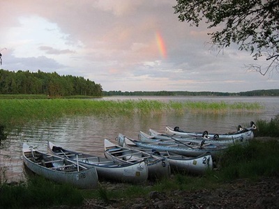 Je vaart in open, tweepersoons, aluminium Canadese kano’s. Ze zijn onzinkbaar en behoorlijk koersvast, hetgeen van belang is wanneer je een meer oversteekt. Er is voldoende ruimte in de boten om alle bagage te vervoeren. Je krijgt een waterdichte ton mee van ca. 60 liter.